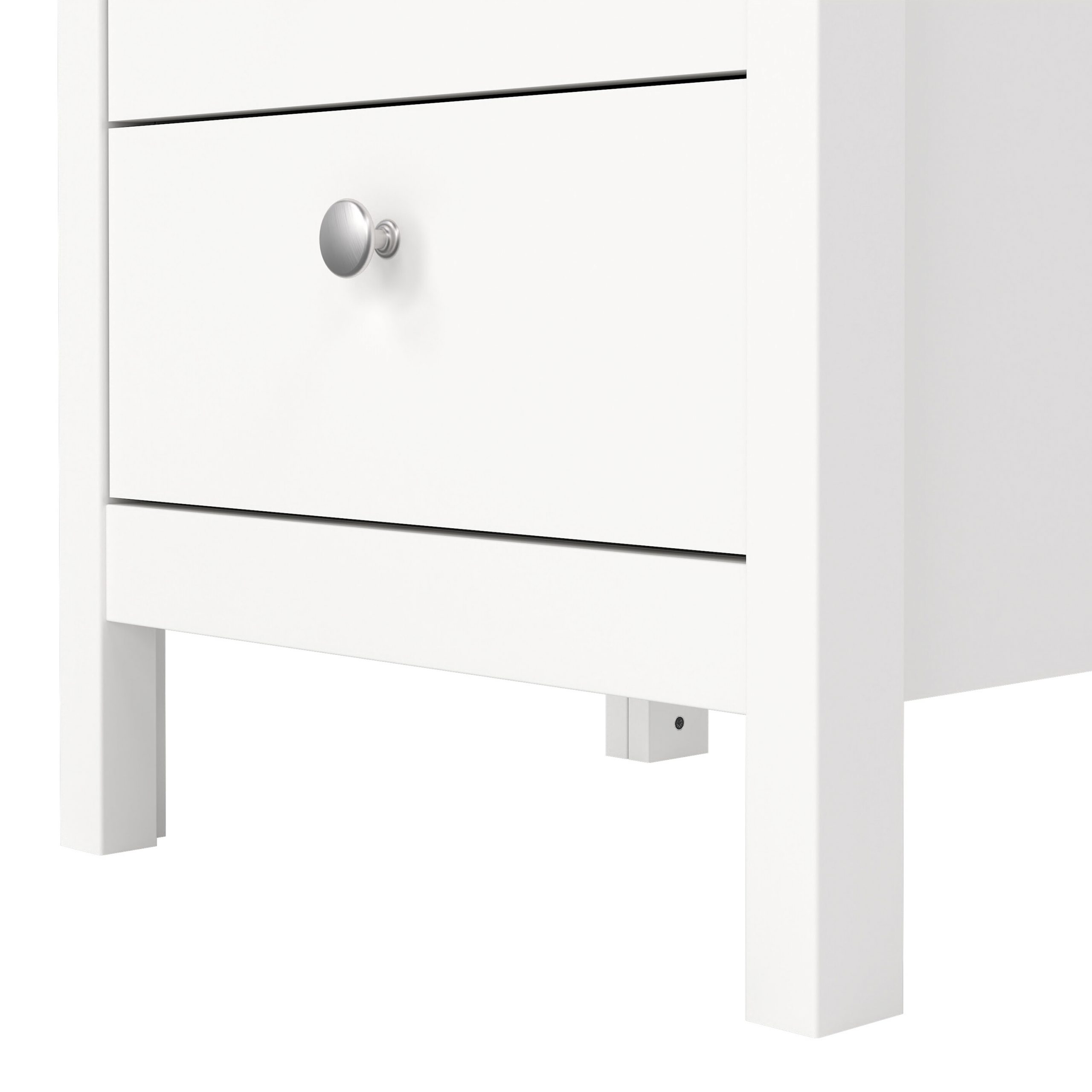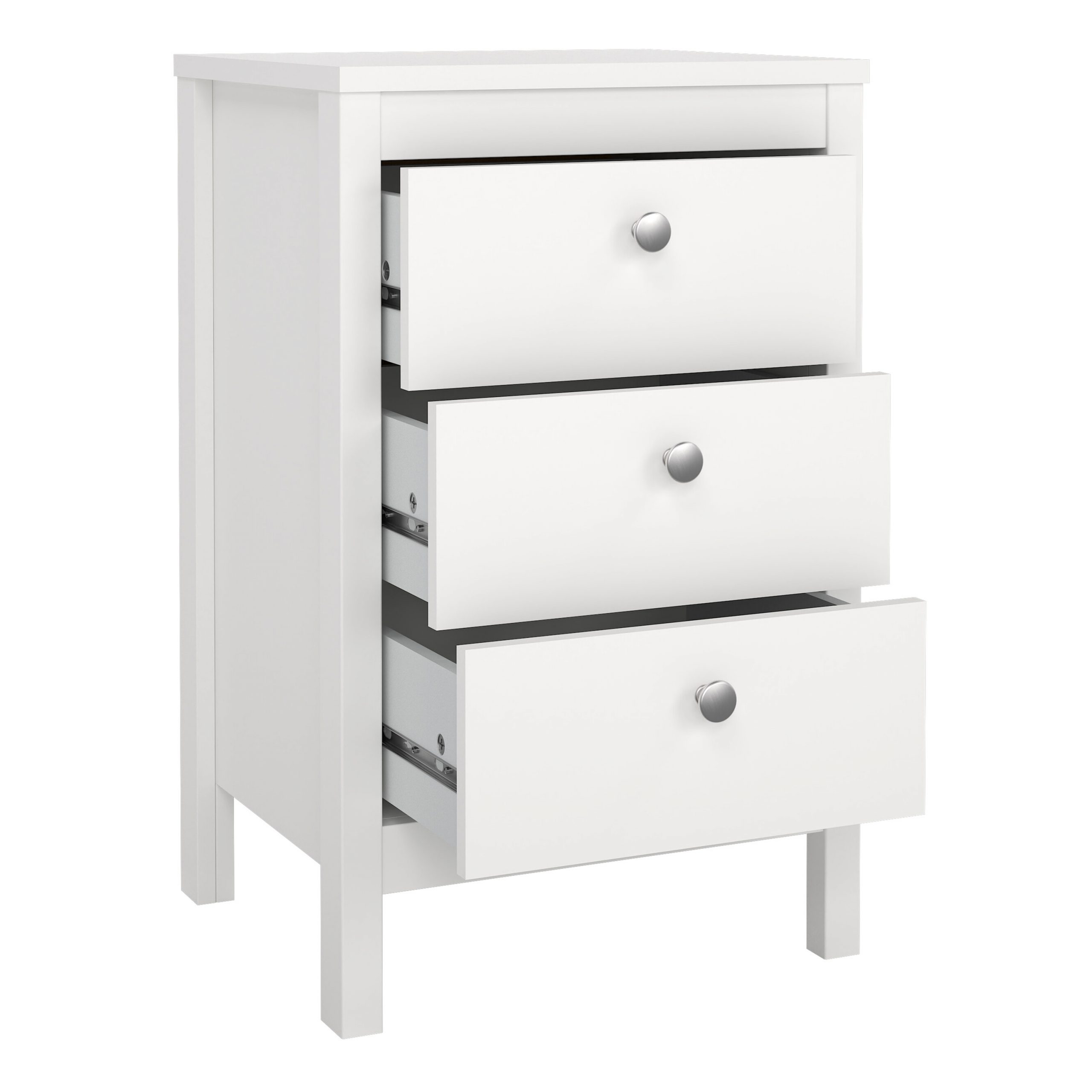Enhance your bedroom with the elegant Madrid Bedside Table. Made with a white finish, it features three drawers with sleek metal handles and smooth gliding runners. This stylish and functional piece is perfect for any modern bedroom.